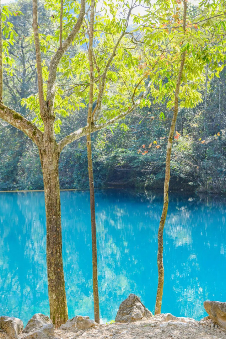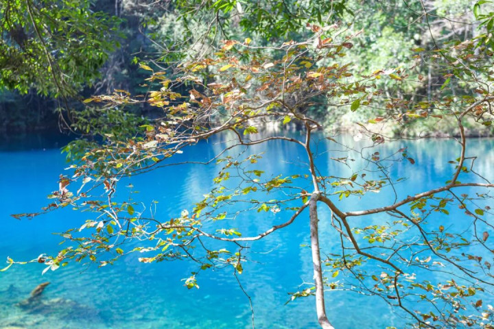 小七孔有“地球腰带上的绿宝石”之称。冬季水位适中,68级跌水瀑布层次分明,水上森林依然青翠,鸳鸯湖的湖水如宝石般湛蓝。