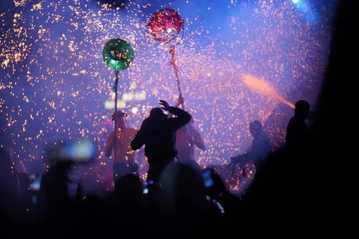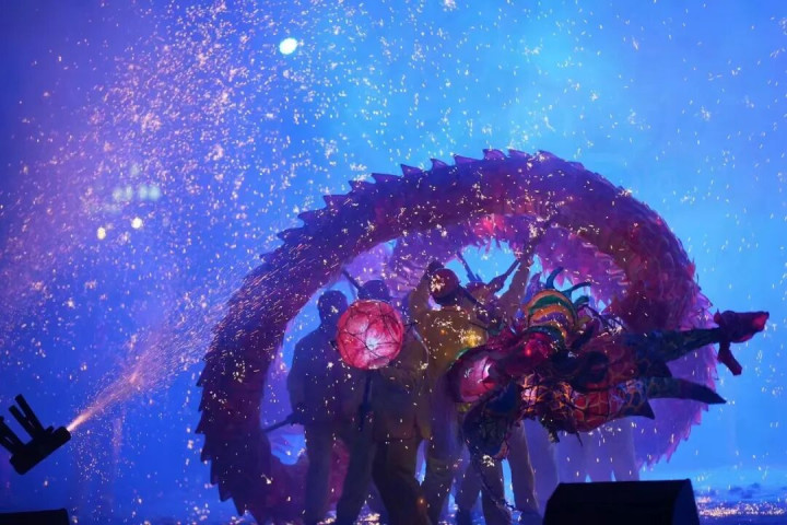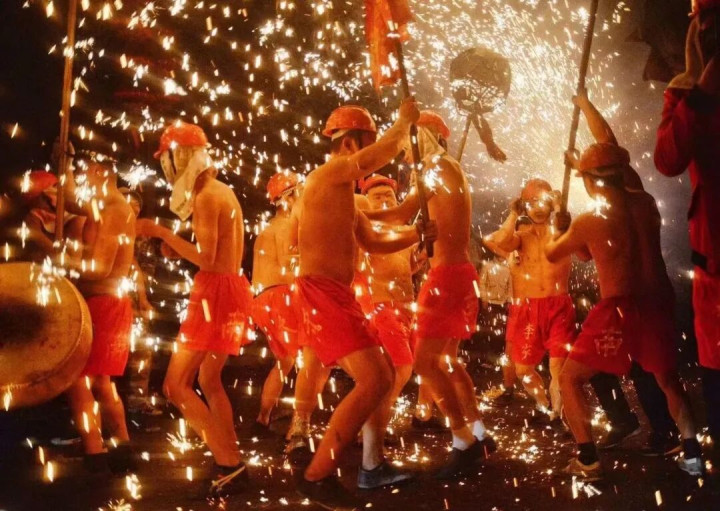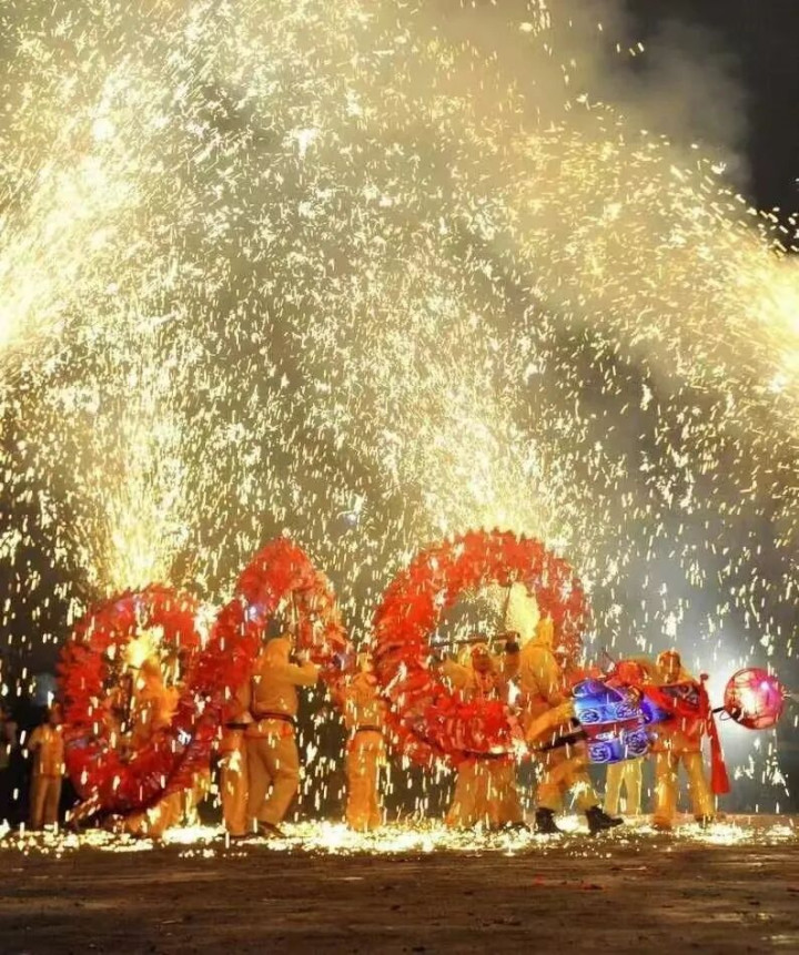 手持竹制花筒的人们,向舞动的龙身喷射烟花,火树银花中,舞龙者与观者一同呐喊,构成一幅震撼人心的画面。