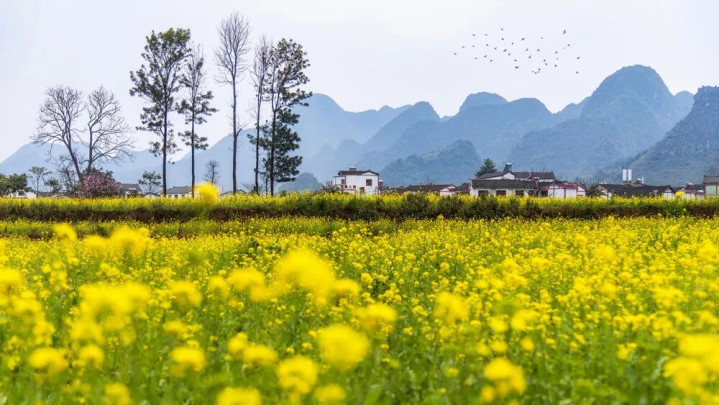 每年春节前后,这里便成为金色的海洋——6000余亩的油菜花在峰林间层层铺展。