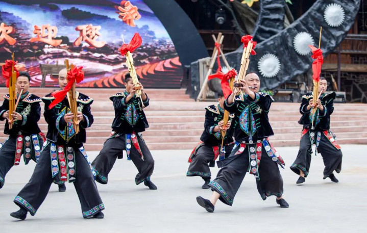 春节期间,苗寨里会举行各种迎春活动,芦笙响起,苗族姑娘小伙们身着盛装跳起舞蹈。