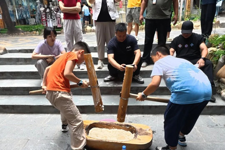 你也可以参与当地人的“打糍粑”,体验糯米在捶打的过程中逐渐变得软糯黏稠的过程,再将亲手制作的糍粑裹上黄豆粉和白糖,品尝第一口香甜。