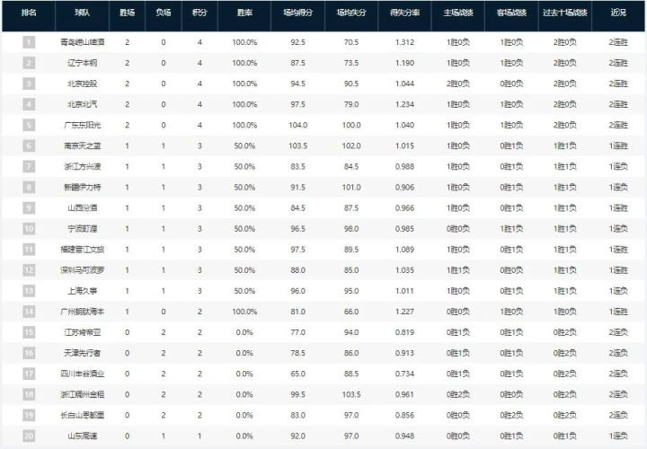 CBA联赛已经打完了两轮,从比赛的情况来看,由于比赛时间被缩短,外援在比赛中的重要性得到了加强,球队间的实力差距明显变小,比赛的悬念增大了很多。不过在前两轮的比赛中,依旧有些球队的表现非常不错,比如青岛男篮、辽宁男篮,北京男篮和广东男篮。另外卫冕冠军广厦男篮以及同样在休赛期里进行了补强操作的上海男篮,表现都比较一般。而浙江男篮更惨,遭遇了两连败。来看一下最新的积分榜情况。