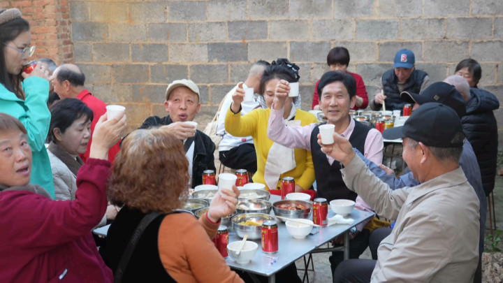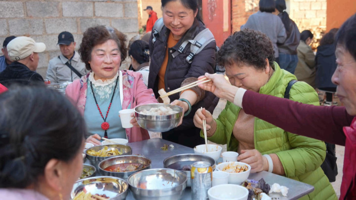 这天,普者黑村古井园的杀猪宴现场热闹非凡。来自四川成都的游客肖坤智与同伴们围坐一桌,正尽情享用美食。“来,尝尝这块肥肉。”“谢谢,真是太热情了!”肖坤智笑着分享,“这‘坨子肉’让我一下子想起几十年前当知青时的味道,今天第二次吃到,感觉特别亲切。”