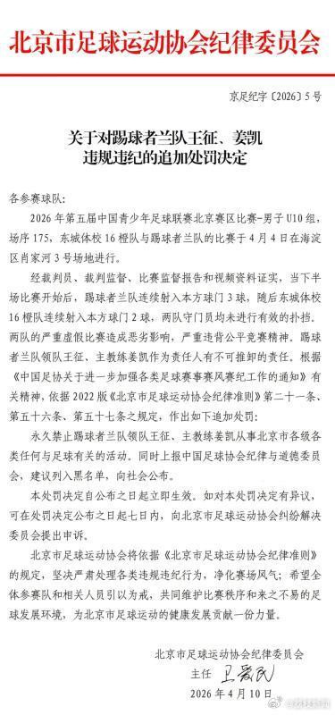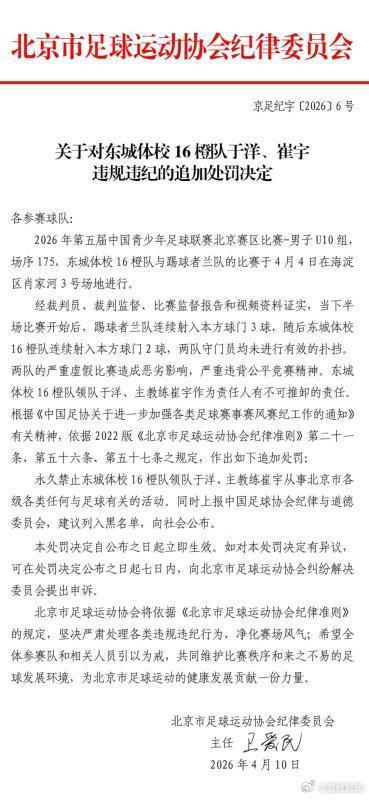 4月9日,北京市足协发布处罚措施,仅对涉事球队取消比赛资格,双方领队和主教练只禁足一年。4月10日,北京市足协升级处罚措施,对两队领队、主教练追加终身禁足处罚。