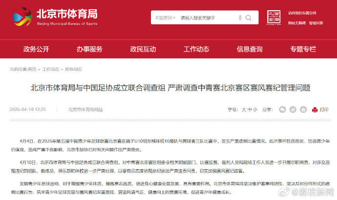 北京市体育局与中国足协已成立联合调查组,对赛区组委会相关职能部门、比赛监督、裁判人员和现场工作人员进一步开展尽职调查。