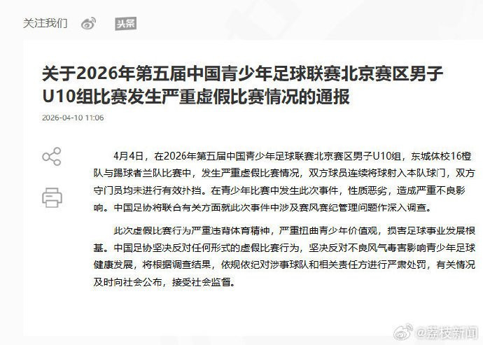 [#足协称踢假球严重扭曲青少年价值观#]#中青赛踢假球领队和教练被终身禁足#4月10日,中国足协回应中青赛北京赛区U10组别出现互射乌龙事件,称此次虚假比赛行为严重违背体育精神,严重扭曲青少年价值观,损害足球事业发展根基。将根据调查结果,依规依纪对涉事球队和相关责任方进行严肃处罚。