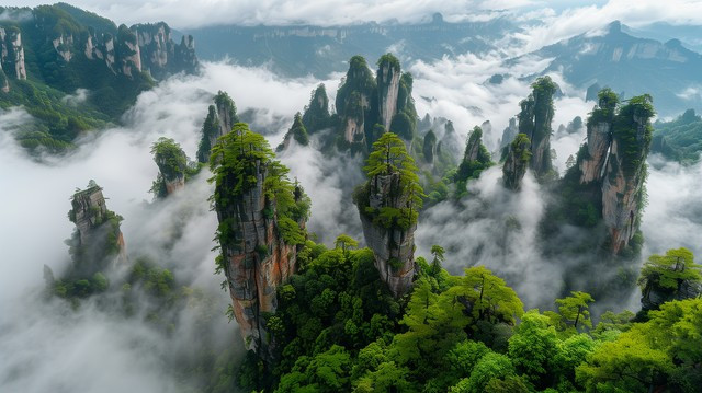 3. 湖南张家界国家森林公园:中国第一个国家森林公园,以独特的石英砂峰林地貌著称,是电影《阿凡达》中悬浮山的取景地。