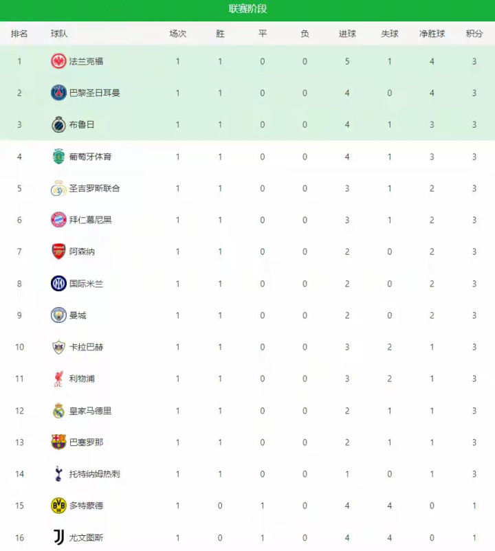 随着以上六场比赛的完结,欧冠联赛阶段首轮全部结束,最新积分榜如下:领跑的竟然是德甲的法兰克福,垫底的却是亚特兰大,当然了,这只是第一轮。