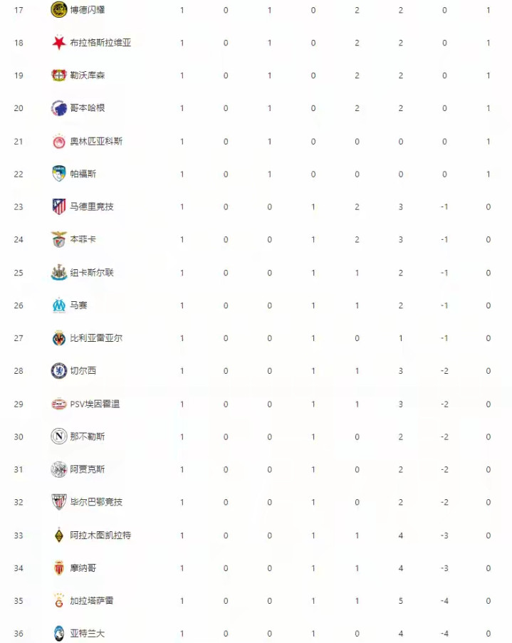 除布鲁日爆冷摩纳哥,哥本哈根爆冷勒沃库森外,另外四场比赛没有悬念,实力更强的球队获得了胜利。