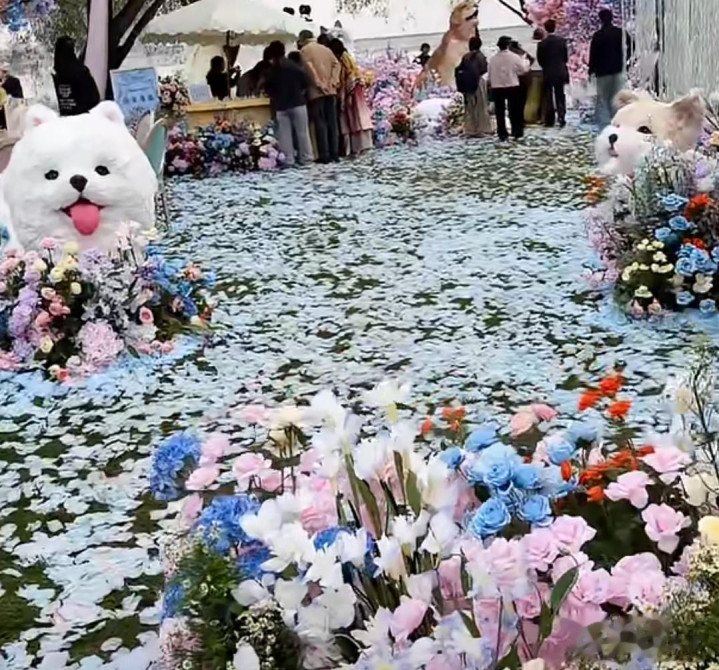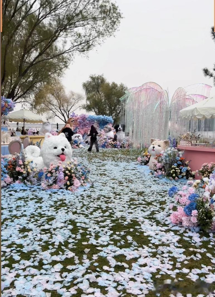 黄子韬在直播说婚礼筹备都是徐艺洋操作,看到直播中的现场置景,想说这怕不是他的免责声明。现场使用了大量的绣球花,空地上铺满了蓝色花瓣,四周还摆设了不少动物玩偶造型,看起来不伦不类。而且认真看,现场置景没有大花费,十分的简陋,场地也不大。