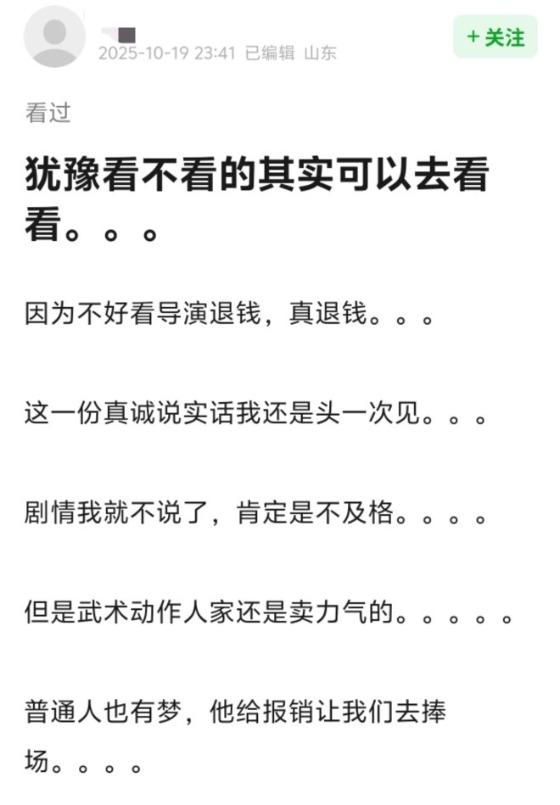 大皖新闻记者查看豆瓣APP发现,确有一位网友发帖称,“犹豫看不看的其实可以去看看。因为不好看导演退钱,真退钱。普通人也有梦,他给报销让我们去捧场。”