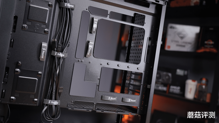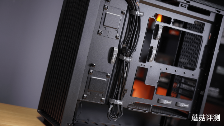 ▼右侧主板位置的背面,有多个魔术贴,辅助固定各种线材,搭配背插主板理线更轻松。