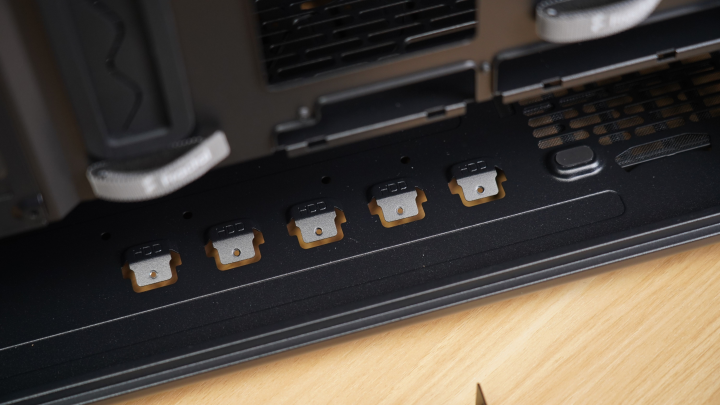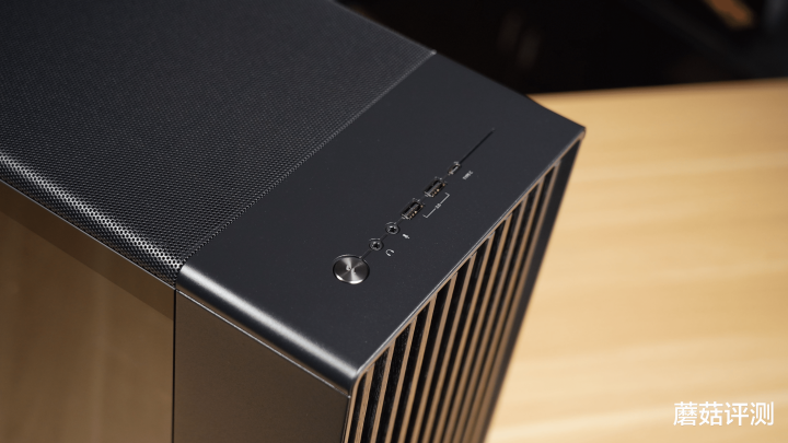 ▼机箱的IO面板在机箱前部的顶部,从左到右依次是开机键、3.5mm音频接口2个、USB 3.0接口2个和Type-C接口1个。
