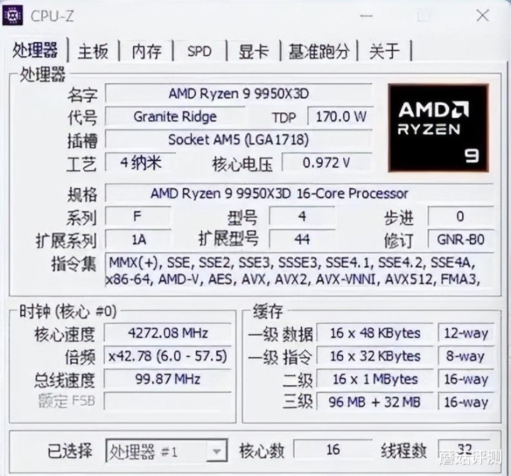 ▼简单看下9950X3D的硬件规格,16核32线程,三级缓存96+32MB,一个是普通的32MB三缓,一个是96MB超大的X3D大三缓,在拥有很优秀的多线程性能的同时,还能在游戏中有更好的表现。