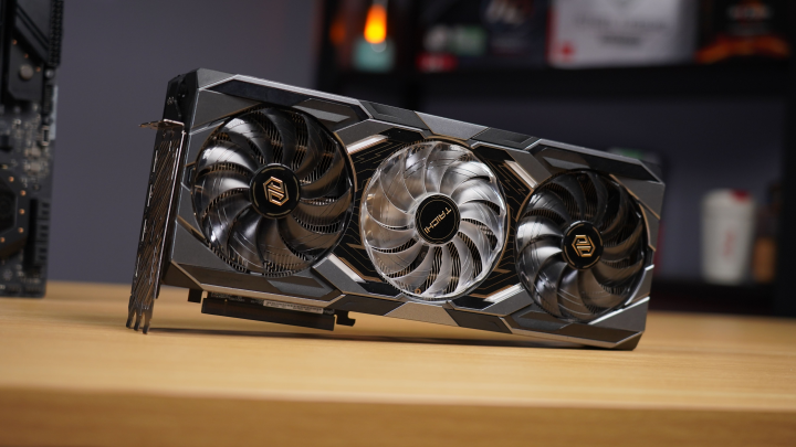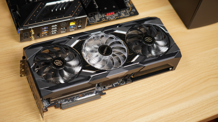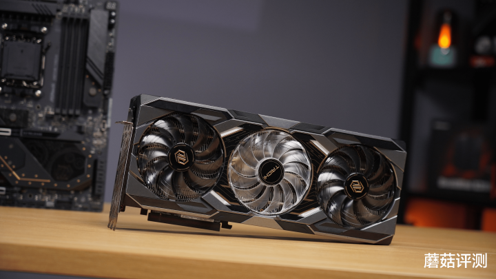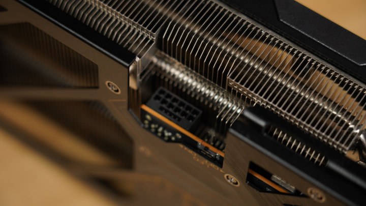 ▼显卡正面标配三把风扇,其中中间的那一把采用反转设计,这种设计让两把散热风扇互相交接的地方线速度相同,可以更好的梳理风道,提高散热效率。