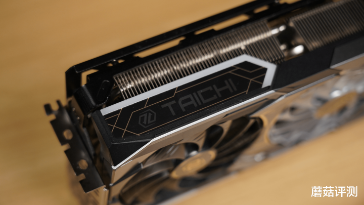 ▼显卡背面是一整块的金属背板,表面有漂亮的涂装,还有太极系列标志性的齿轮元素。在显卡的尾部和顶部,还有大面积的镂空,方便散热风扇吹透散热鳍片,提高散热效率。