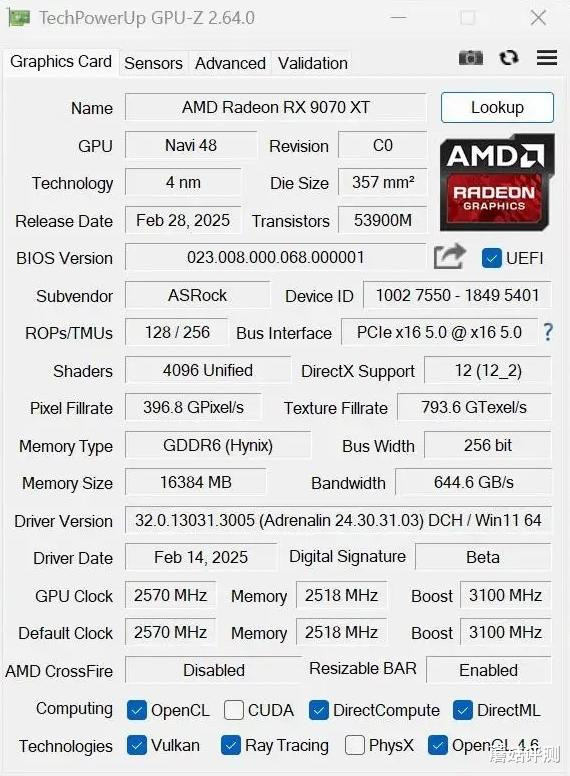 ▼简单看下9070XT的硬件参数,核心是Navi 48,流处理器4096,显存16GB,海力士的GDDR6,看着真不错。