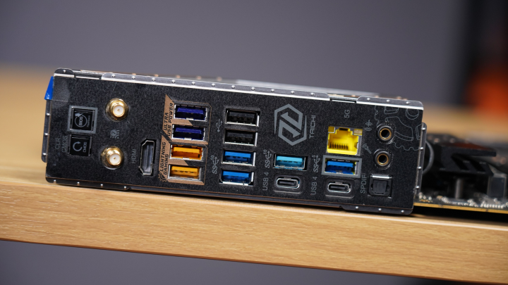 ▼主板的后部IO接口方面,采用一体化的挡板,日常装机更方便。接口方面,除了这个级别主板常见的一些接口之外,还有两个LIGHTING GAMING接口和两个ULTRA POWER接口,前者给一些超高回报率的电竞键盘、鼠标提供支持,后者应付一些供电需求更大的独立声卡之类的设备也很轻松。