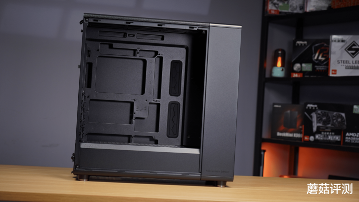 ▼机箱内部的空间非常规整,左侧是主板的安装固定位,最大支持ATX规格,支持背插主板。