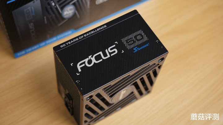 ▼海韵这款电源的颜值很漂亮,电源侧面斜纹打底,中间是FOCUS的系列名称,旁边和顶部还有海韵50周年的纪念字样,右下角还有海韵蓝色的小LOGO,很好看。