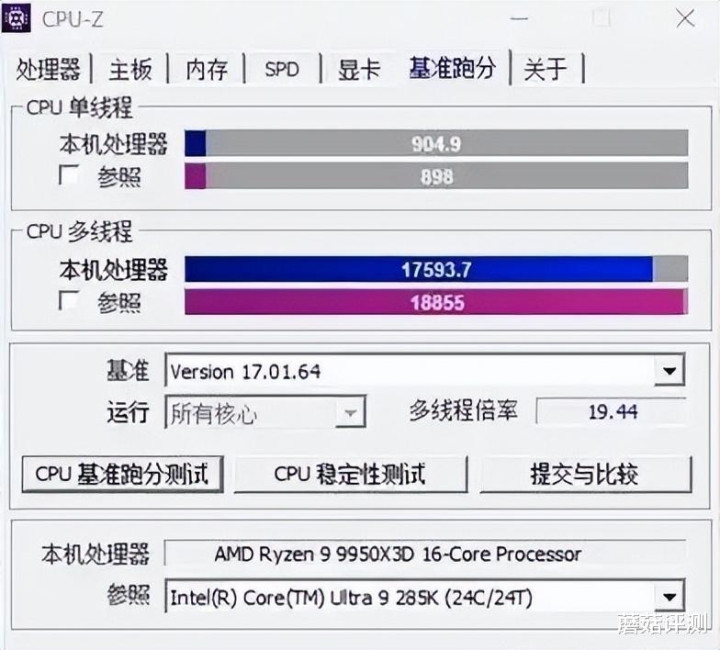 ▼简单跑个CPU-Z的性能测试,单核904.9、多核17593.7,记得开PBO。